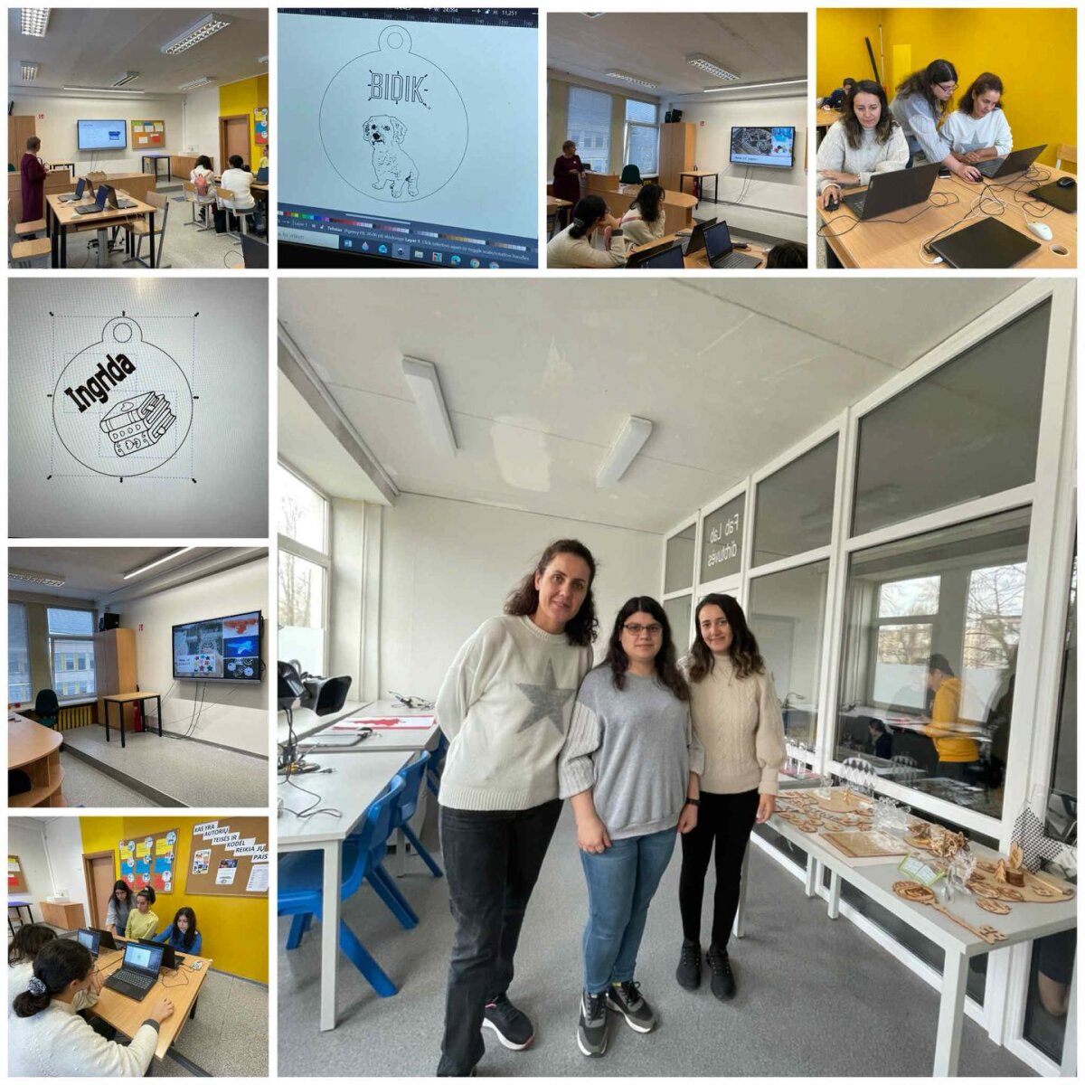 Modernios FabLab dirbtuvės tapo dar viena atradimų erdve. Mokiniai susipažino su lazerinėmis graviravimo–pjovimo staklėmis, patys kūrė skaitmeninį raktų pakabuko dizainą, o vėliau gavo ir medinį, realiai pagamintą pakabuką kaip prisiminimą apie viešnagę. Ši veikla padėjo suprasti, kaip idėja virsta kūriniu, o skaitmeniniai įgūdžiai – praktišku rezultatu.