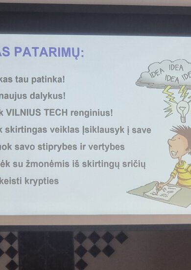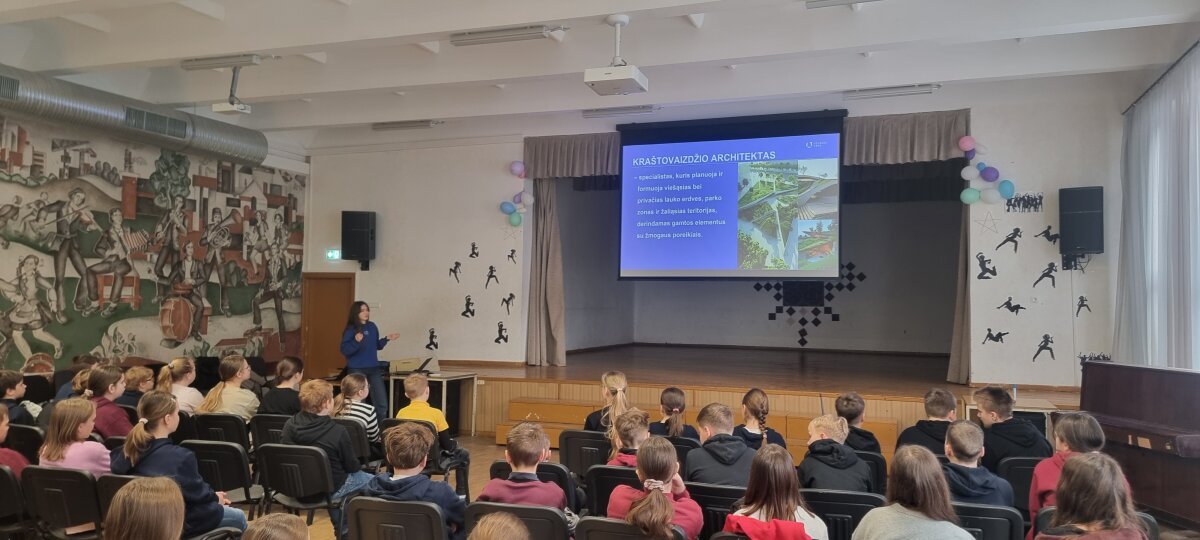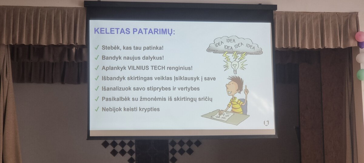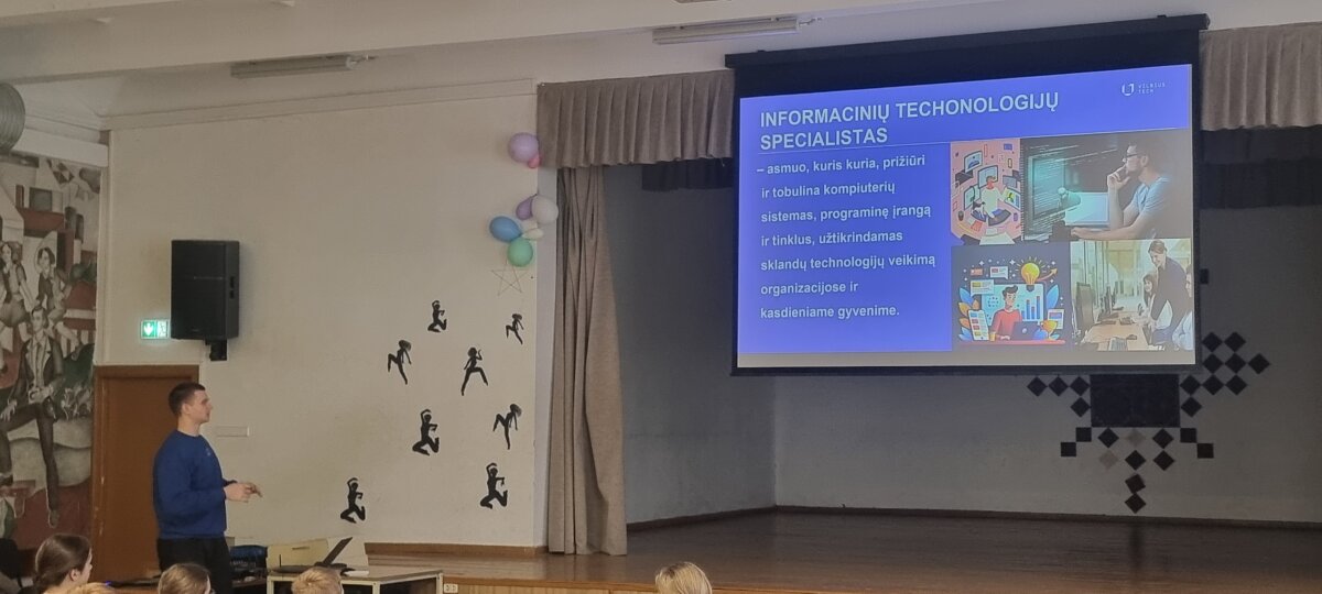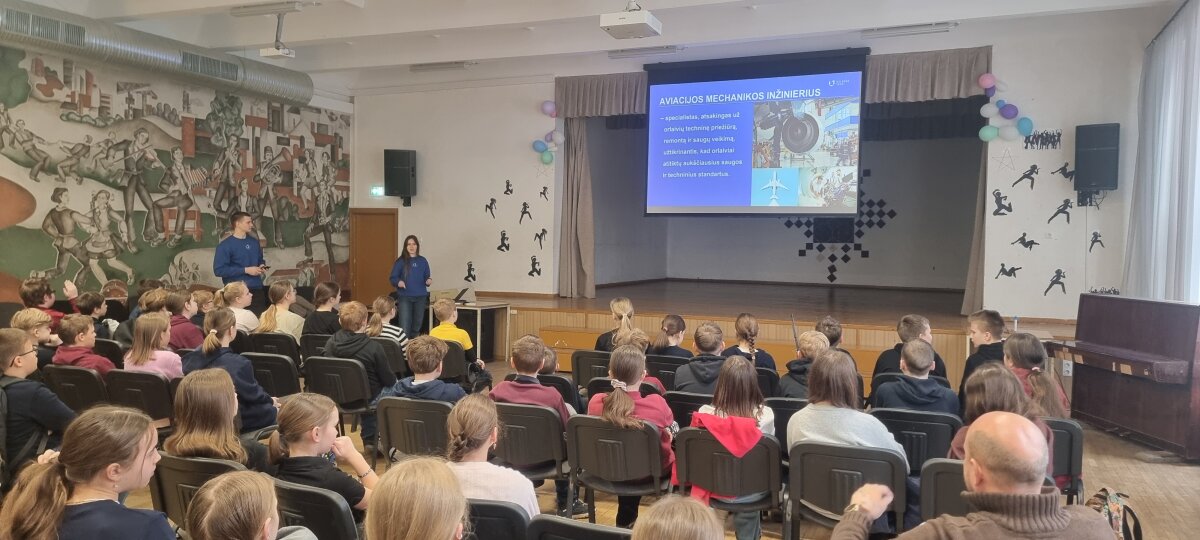 Vilnius Tech (VGTU) studentai–ambasadoriai, statybų inžinerijos programos studentai Deivydas ir Miglė, pamokoje „Ateities kūrėjai: kokias profesijas rinksis rytojus?“ įtraukiančiai pristatė ateities profesijų pasaulį. Mokiniai sužinojo apie galimybes aviacijos, inžinerijos, architektūros, mokslo, verslumo, kūrybinių industrijų, informacinių technologijų bei tvarumo srityse ir diskutavo – kas gi yra svajonių profesija ir kaip ją atrasti?