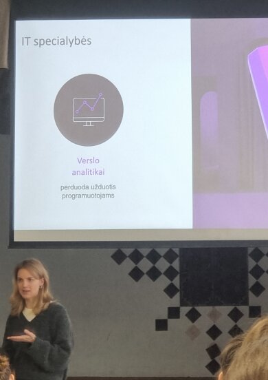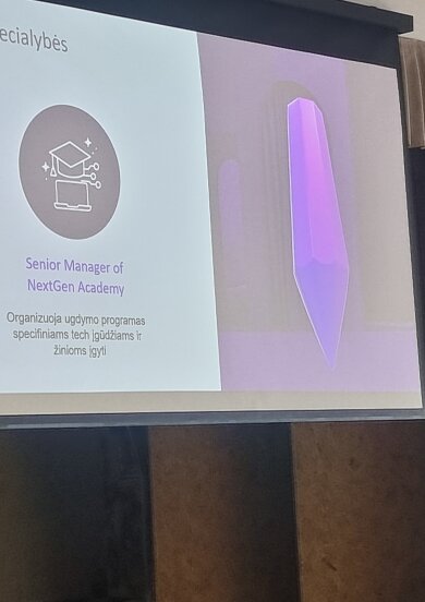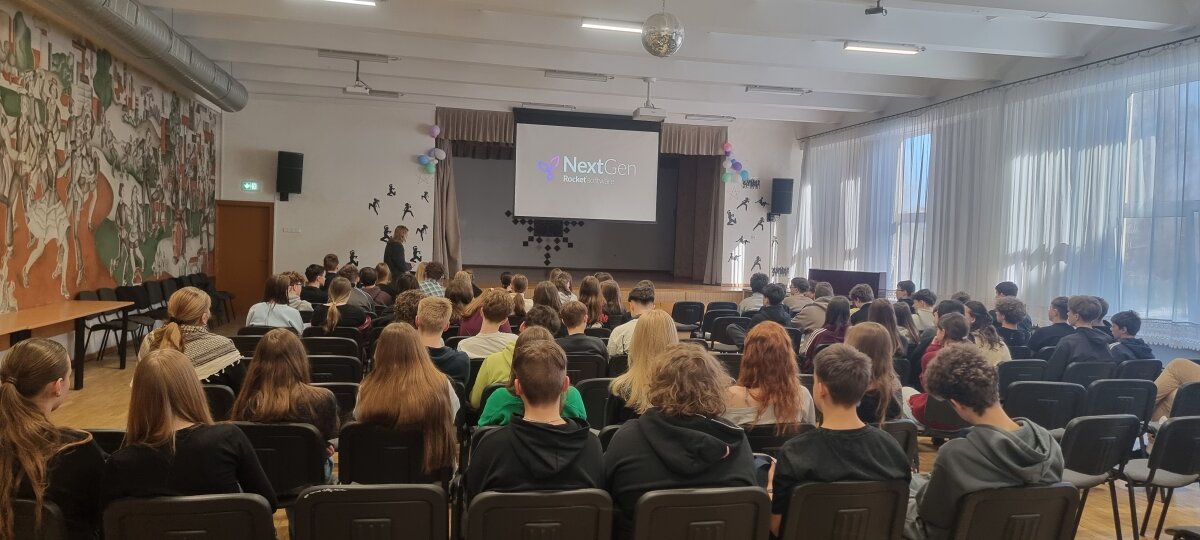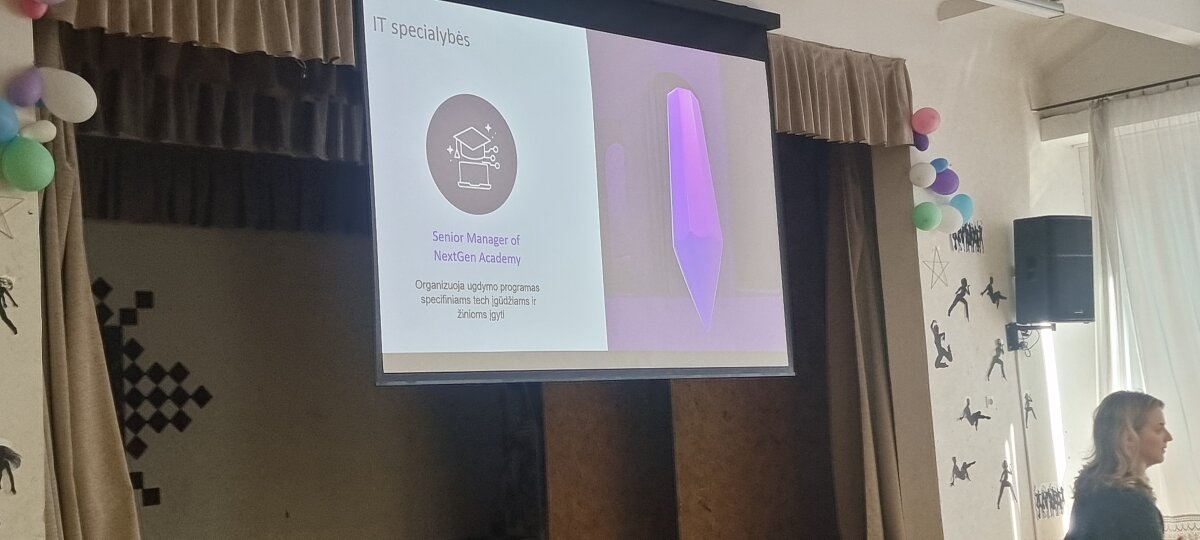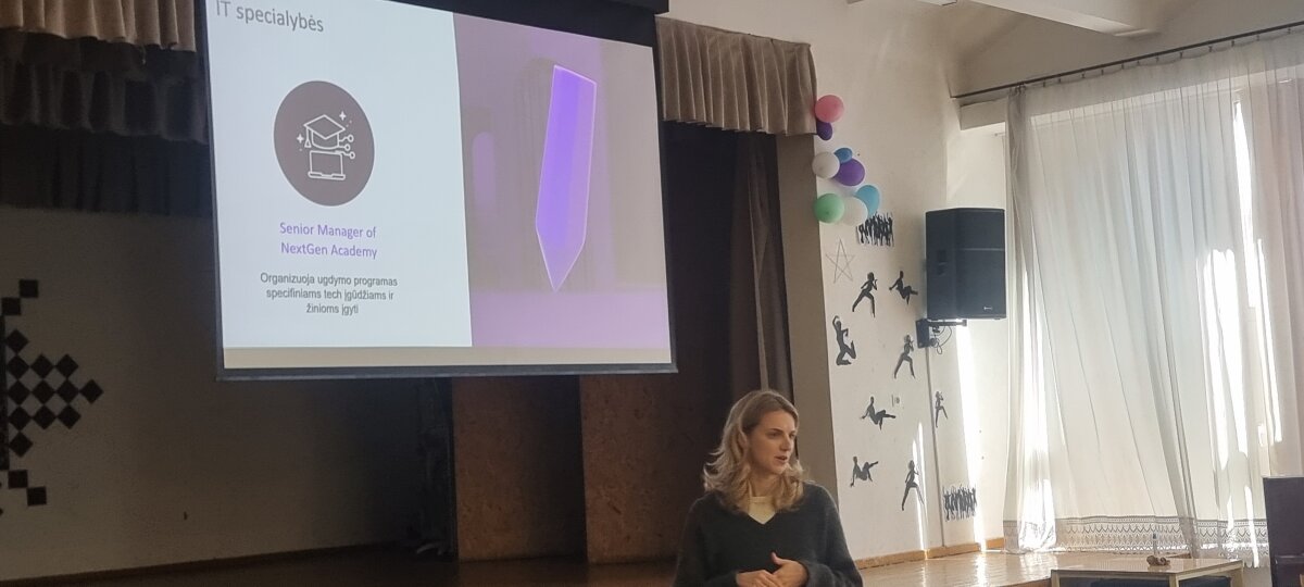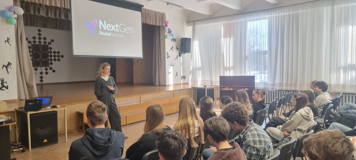 Rocket Software Lietuva atstovė NextGen akademijos vyr. vadybininkė Neringa Lukošiūtė-Sapiegienė pamokoje „Ką daryti, jeigu nori dirbti su technologijomis?“ paneigė mitus apie IT sritį, pristatė įvairias IT profesijas ir pasidalijo patarimais, kaip atrasti savo kelią bei pasiruošti ateities karjerai technologijų pasaulyje.