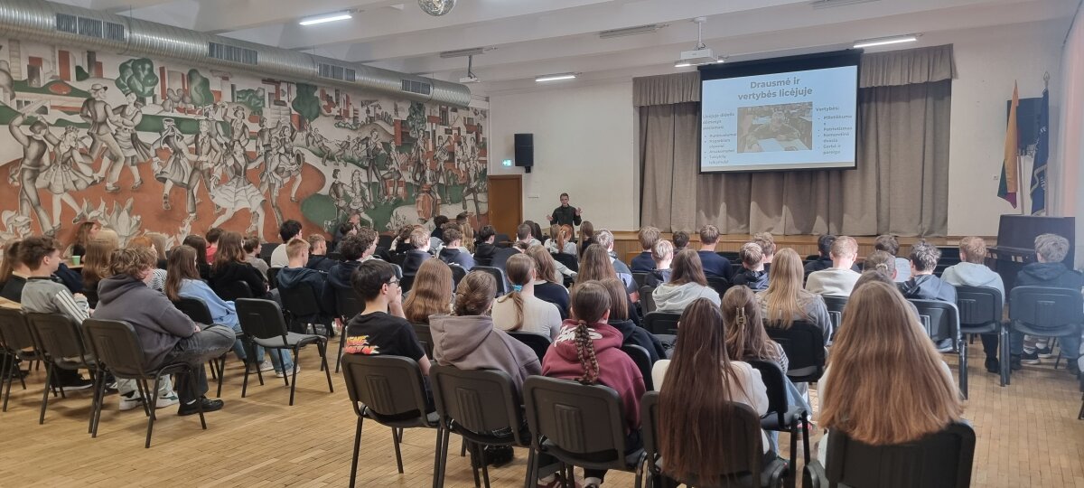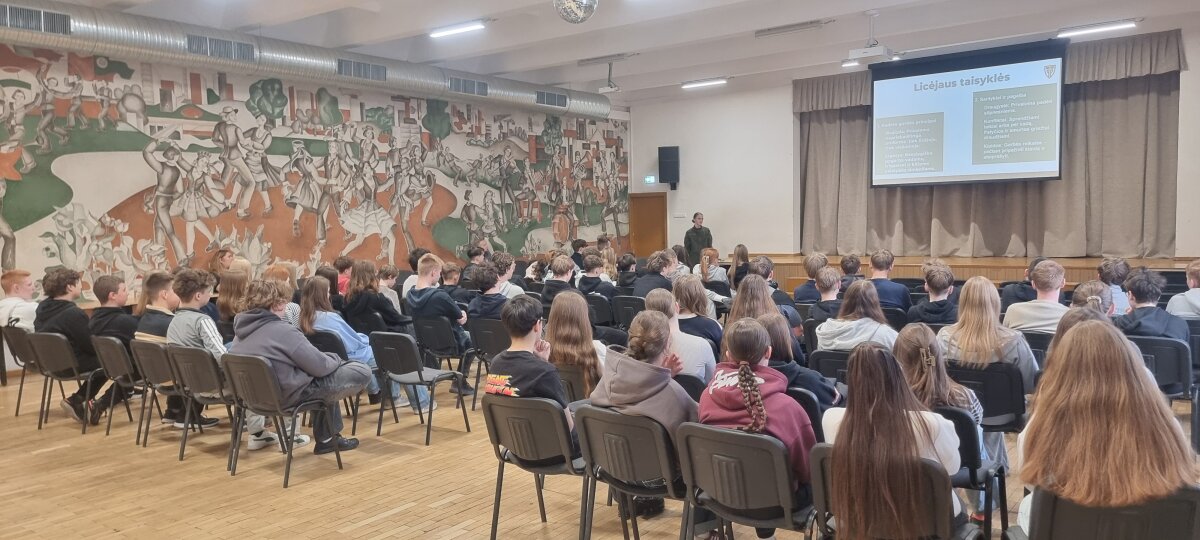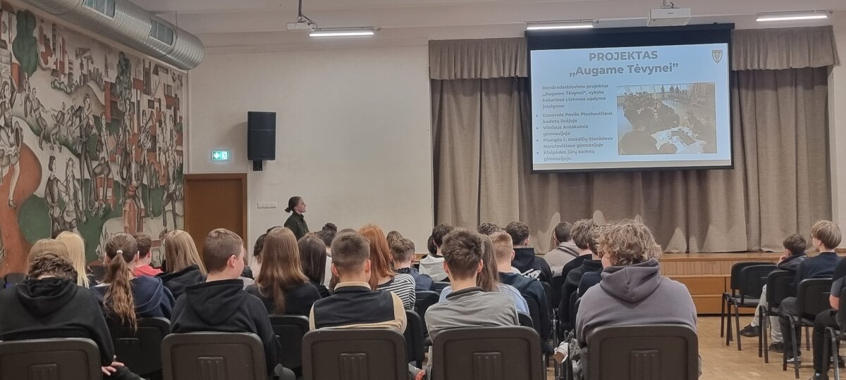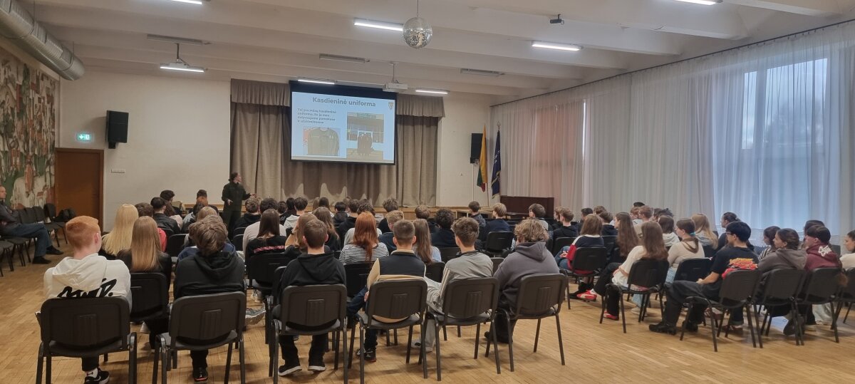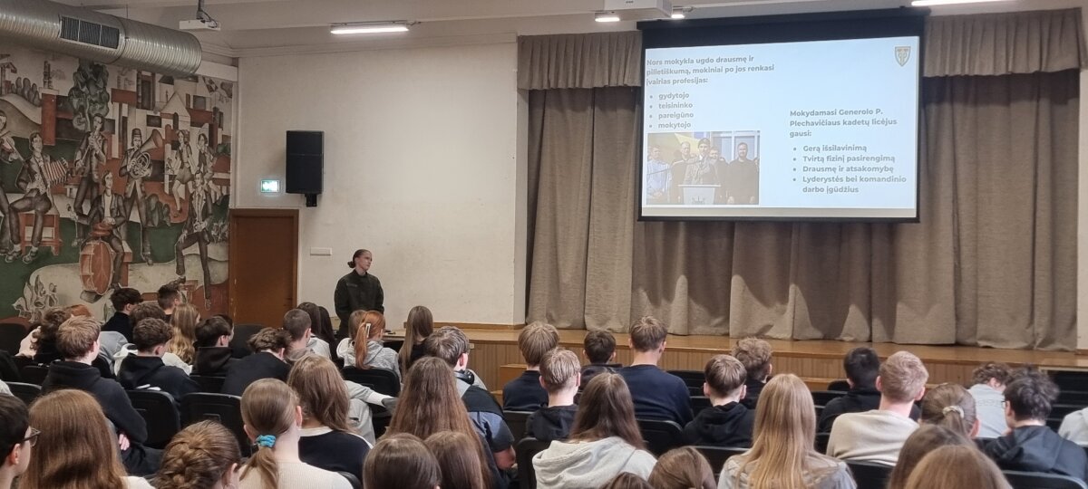 Austėja trumpai apžvelgė gen. P. Plechavičiaus biografiją bei jo nuopelnus Lietuvai, papasakojo apie priėmimo tvarką, mokymosi ir gyvenimo sąlygas bei galimybes, kurios atsiveria pasirinkus šį kelią. Aštuntokai išgirdo, kaip atrodo tikroji kadeto kasdienybė – su iššūkiais, atsakomybe, bet ir stipriu bendrystės jausmu.