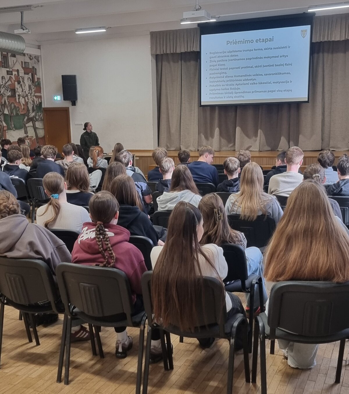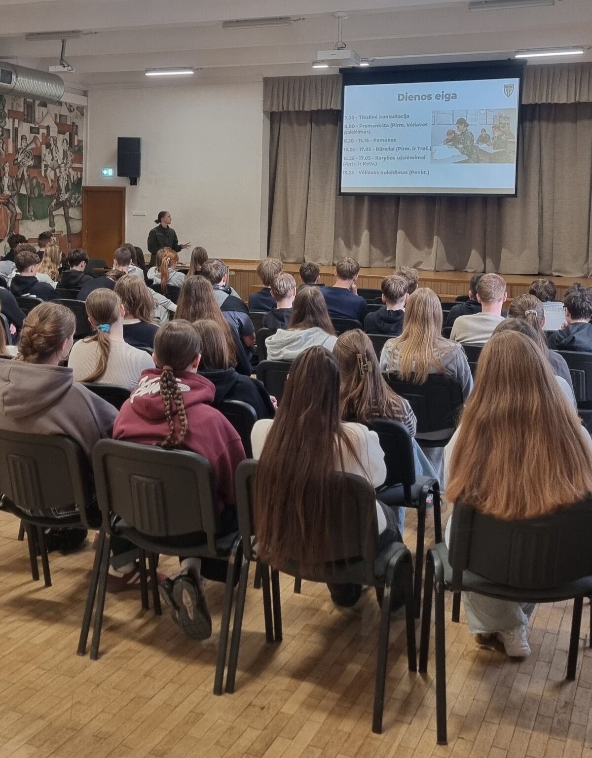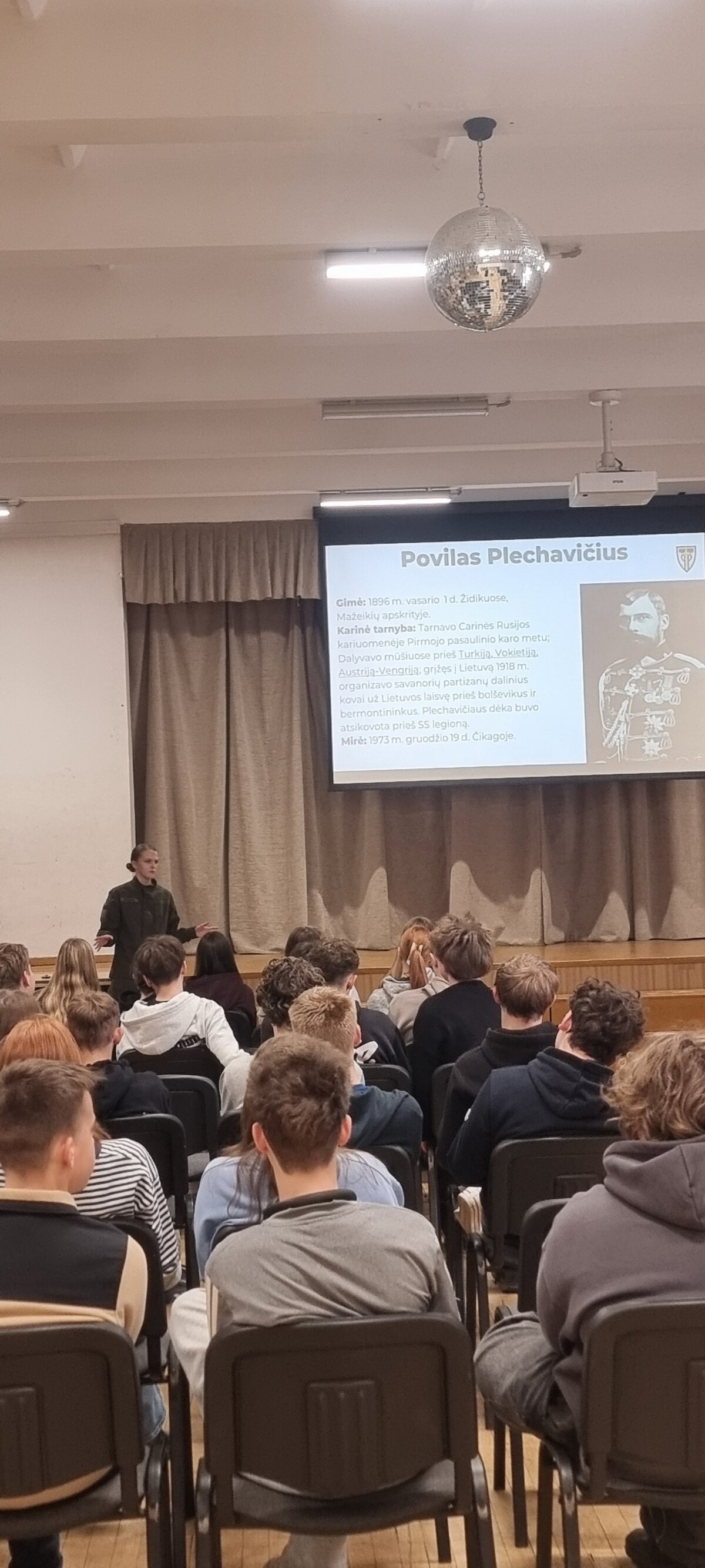 Austėja trumpai apžvelgė gen. P. Plechavičiaus biografiją bei jo nuopelnus Lietuvai, papasakojo apie priėmimo tvarką, mokymosi ir gyvenimo sąlygas bei galimybes, kurios atsiveria pasirinkus šį kelią. Aštuntokai išgirdo, kaip atrodo tikroji kadeto kasdienybė – su iššūkiais, atsakomybe, bet ir stipriu bendrystės jausmu.